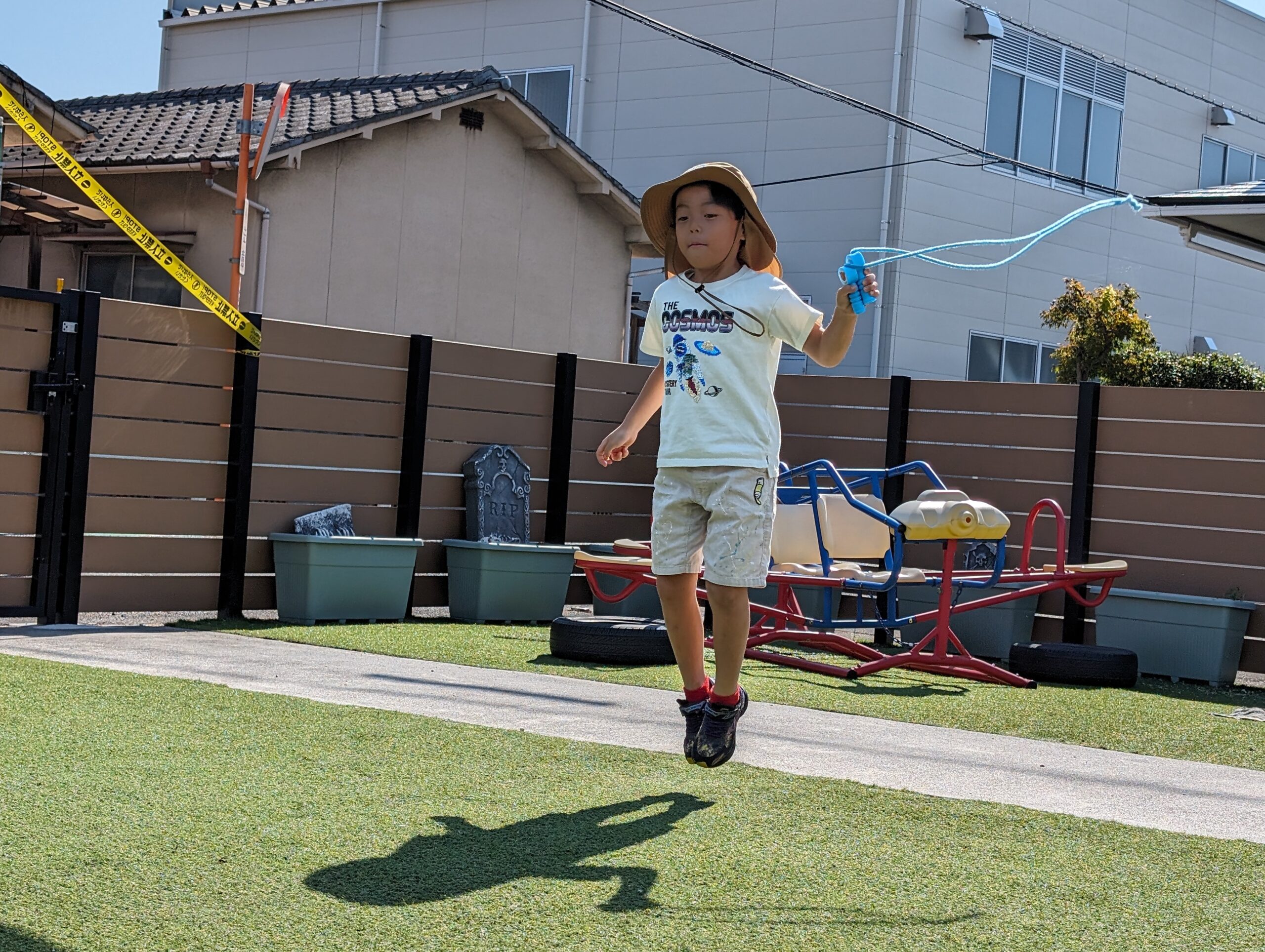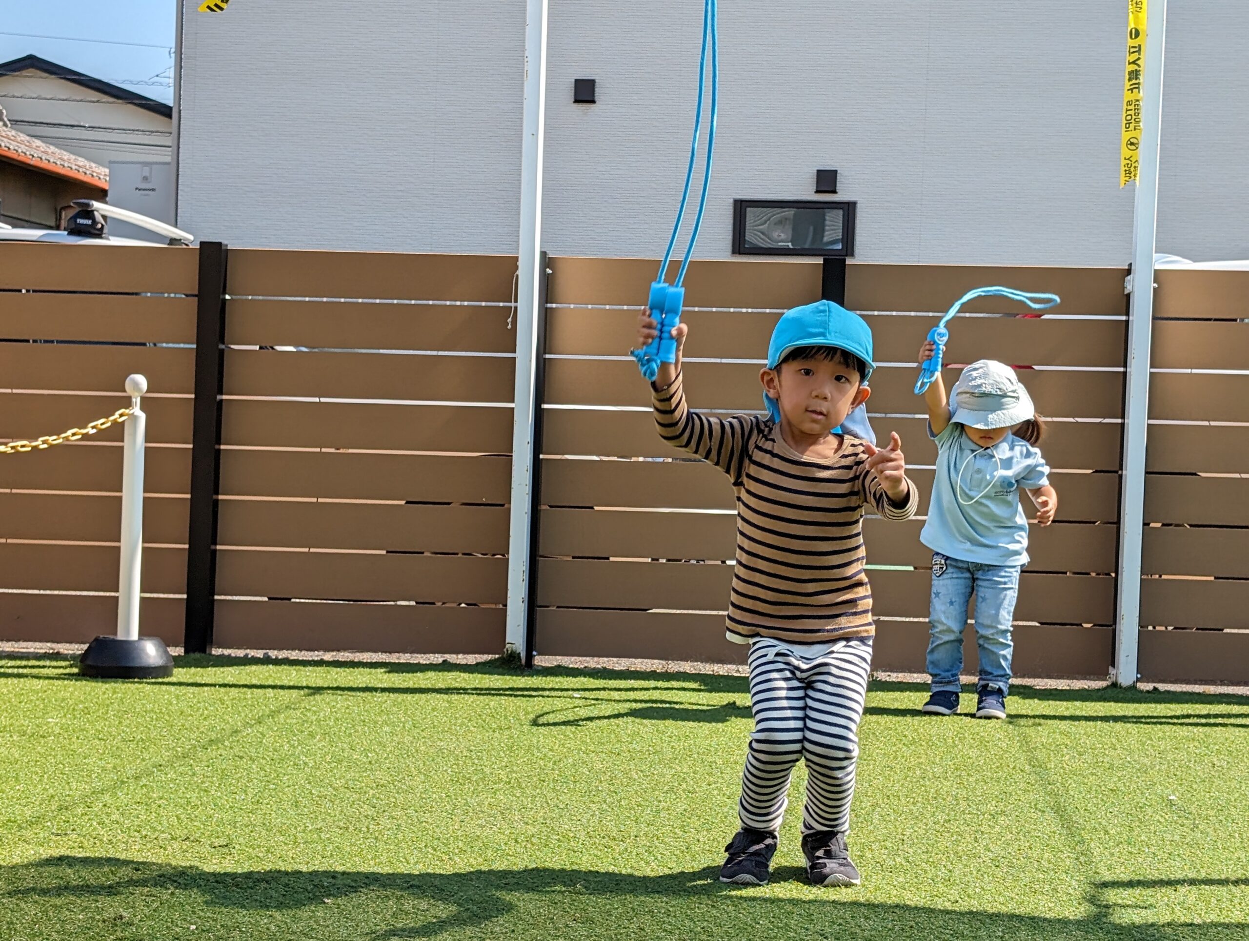 次は片手で縄跳びを持ち、リズム良く回す練習。一人でも上手に回せるようになってきました!